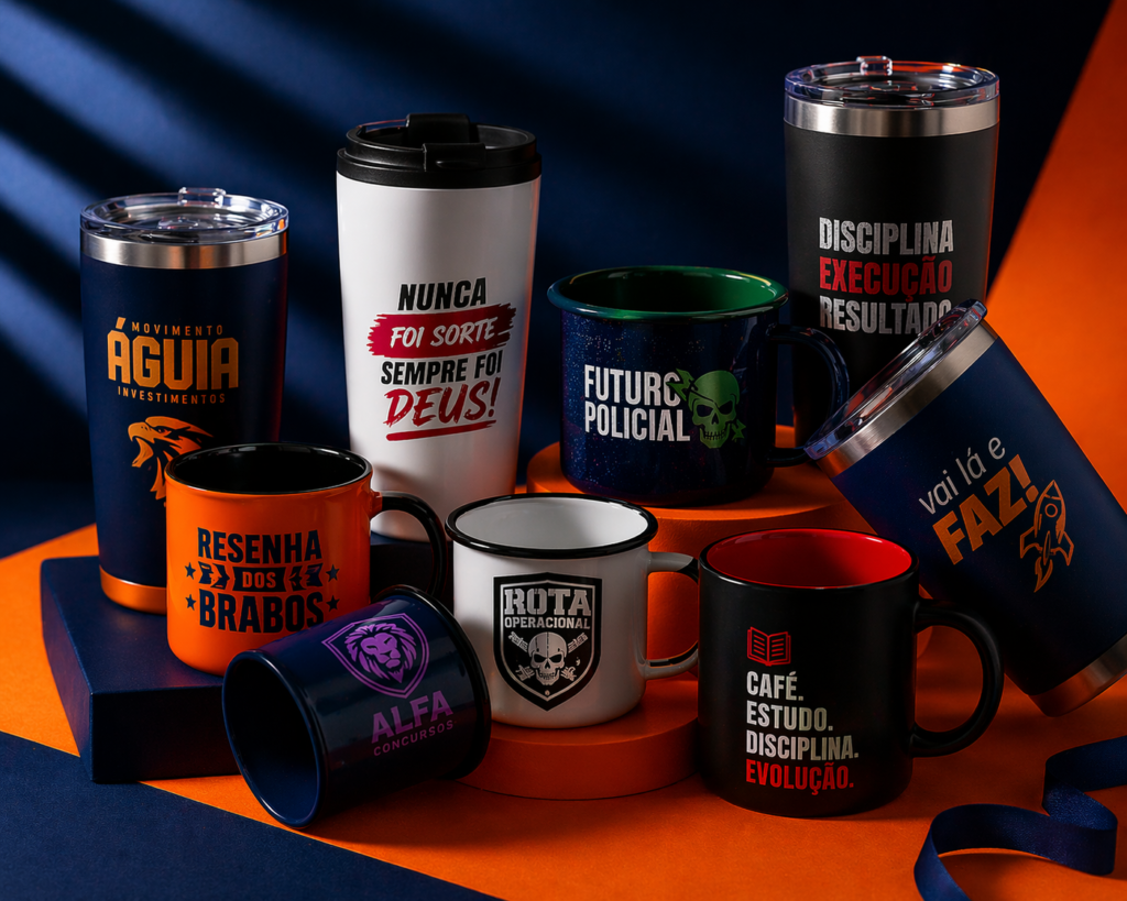 Trabalhamos com diversos modelos, desde canecas tradicionais até copos térmicos modernos, todos com personalização de alta qualidade e excelente acabamento.